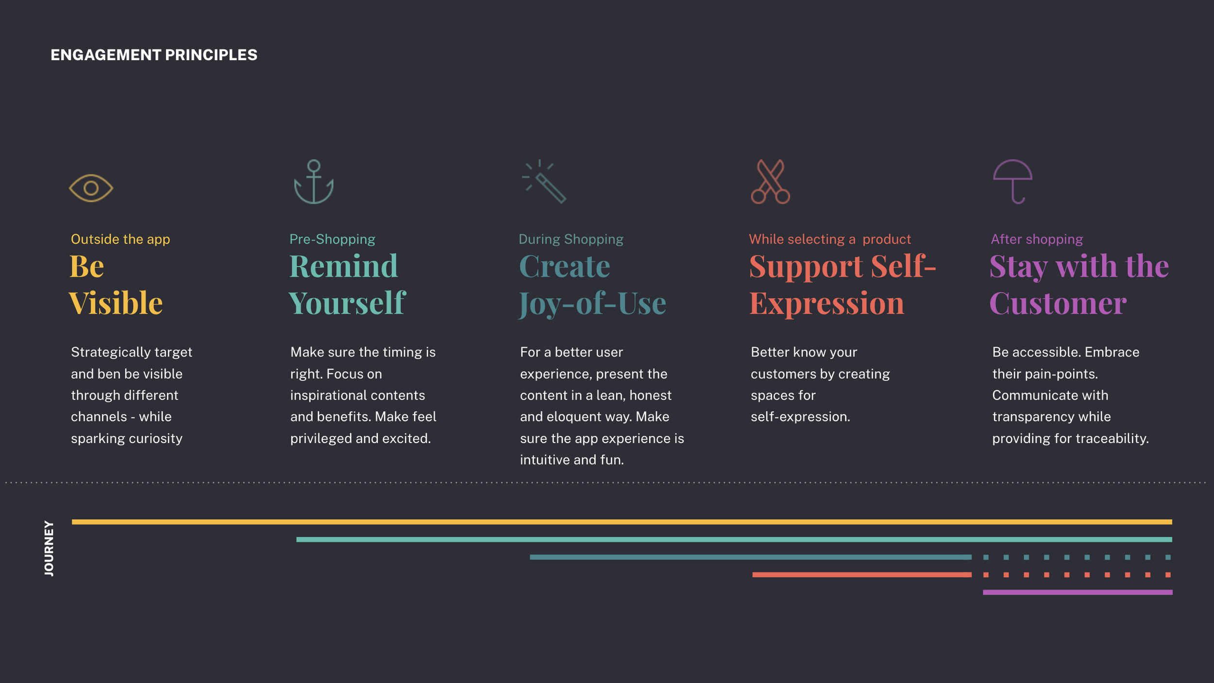 We defined 5 high-level Design Principles for User Engagement mapped over the user journey.
